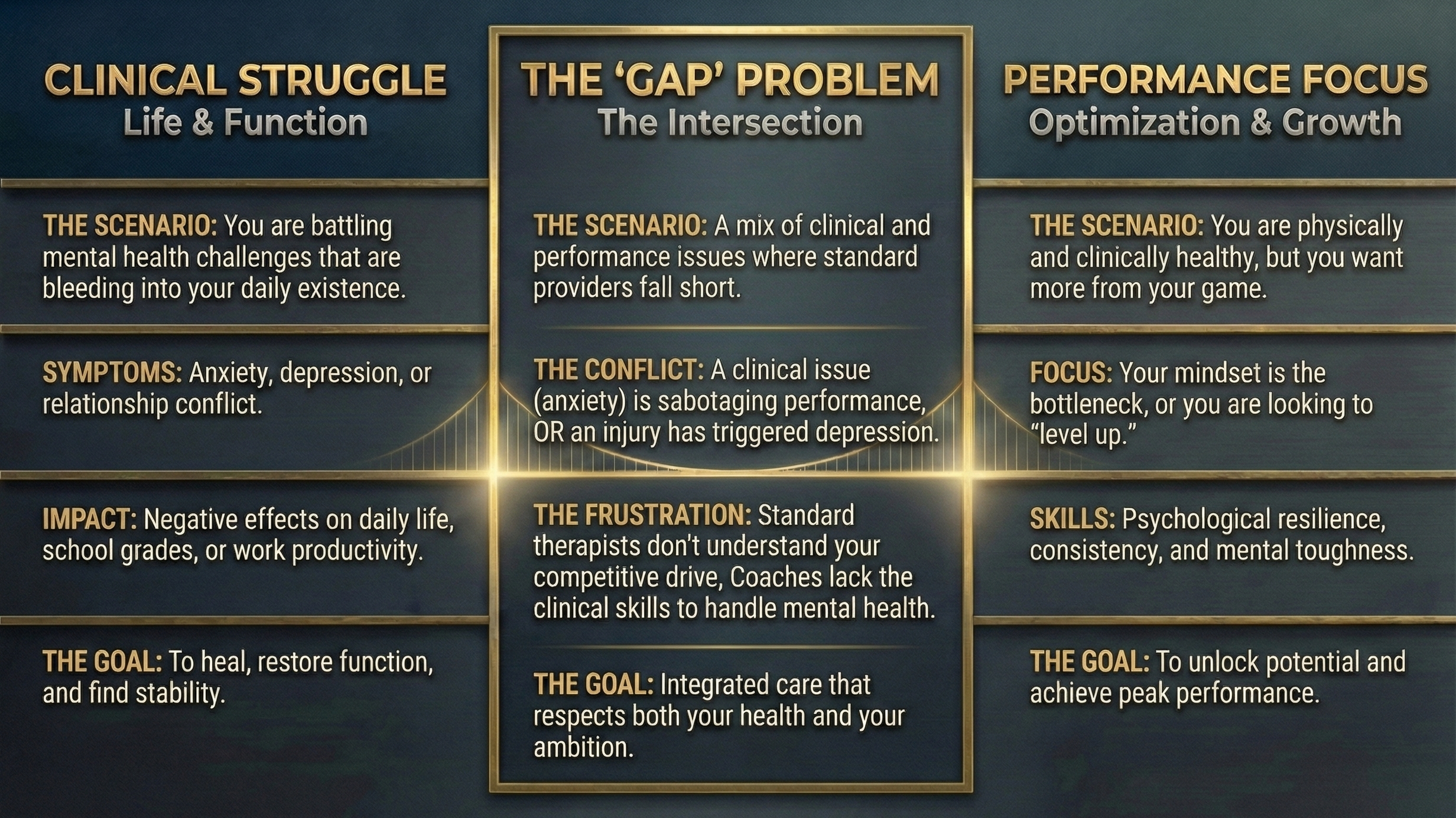 What makes us different is that we refuse to separate your mental health from your performance goals. We know that a clinical issue (like depression) can sabotage your game, and that performance failures (like an injury) can trigger clinical depression.